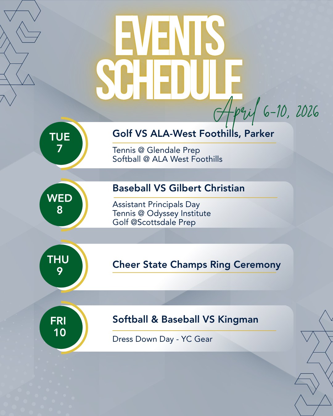 2026 Cow Patty Bingo Click here for more info! State Champs! Shamrock Calendar View All [ APR ] 8 Assistant Principals Day [ APR ] 13 Dress Down Day: Pajama Da... [ APR ] 14 Pre ACT/ACT [ APR ] 14 Dress Down Day: Boys - Fl... [ APR ] 15 Dress Down Day: Camo Day [ APR ] 16 Dress Down Day: Twin Day [ APR ] 18 Prom Quad [ APR ] 21 Powder Puff Game [ APR ] 22 Administrative Profession... [ APR ] 28 Peach Fuzz Game [ MAY ] 1 Principals Day [ MAY ] 2 Cow Patty Bingo News & Announcements View All Upcoming Events