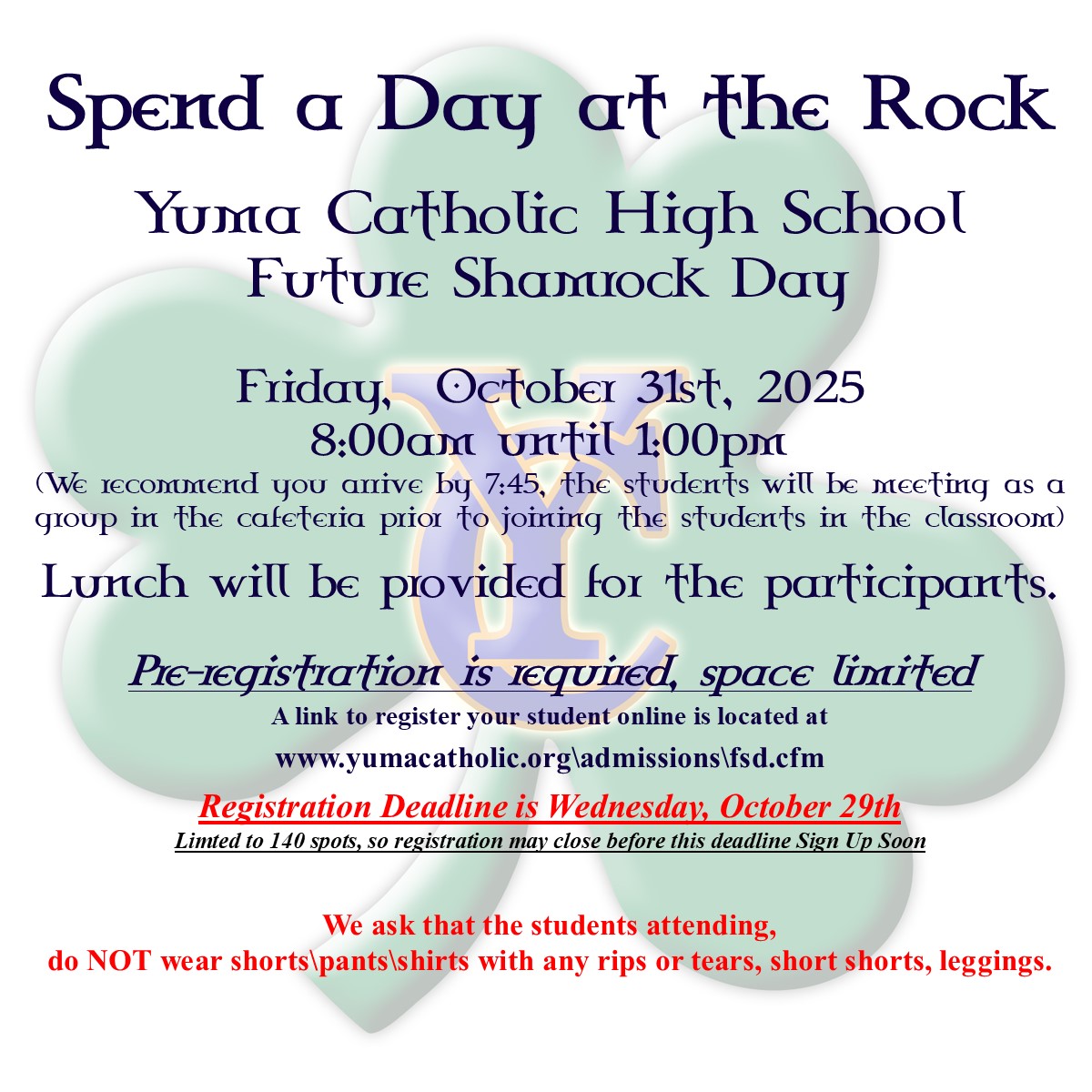 PUBLIC SCHOOL Future Shamrock Day This event is for ALL Area Public School 8th Graders. Future Shamrock Day is October 31st. The link will let you know you have successfully submitted your registration. If you do not see that screen, you can contact me at bhodges@yumacatholic.org CLICK THIS LINK TO GET REGISTERED. SPACE IS LIMITED